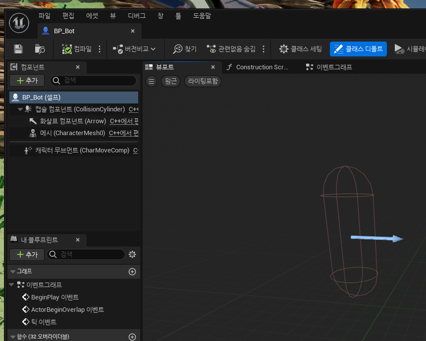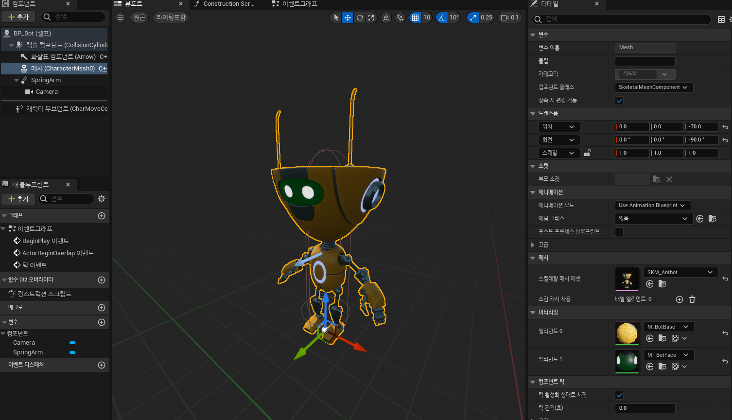 BP_Bot 캐릭터 블루프린트를 열어서 캐릭터 메시를 앞에서 만든 스켈레탈 메시로 적용.