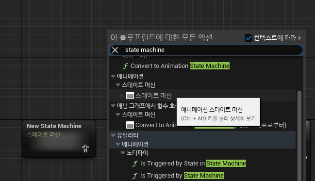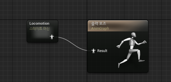 State Machine 노드를 추가. 이제 State Machine 내용을 수정하면 됨. State Machine 내부에 State 를 2개 추가하고 Idle, Walk/Run 으로 수정. 각 State 내부에는 애니메이션 리소스를 연결해줌.