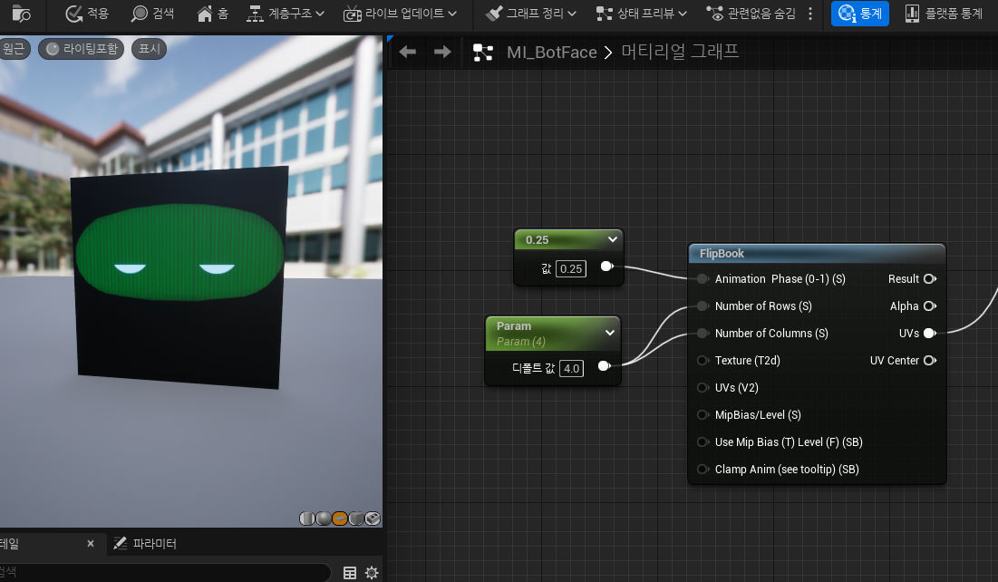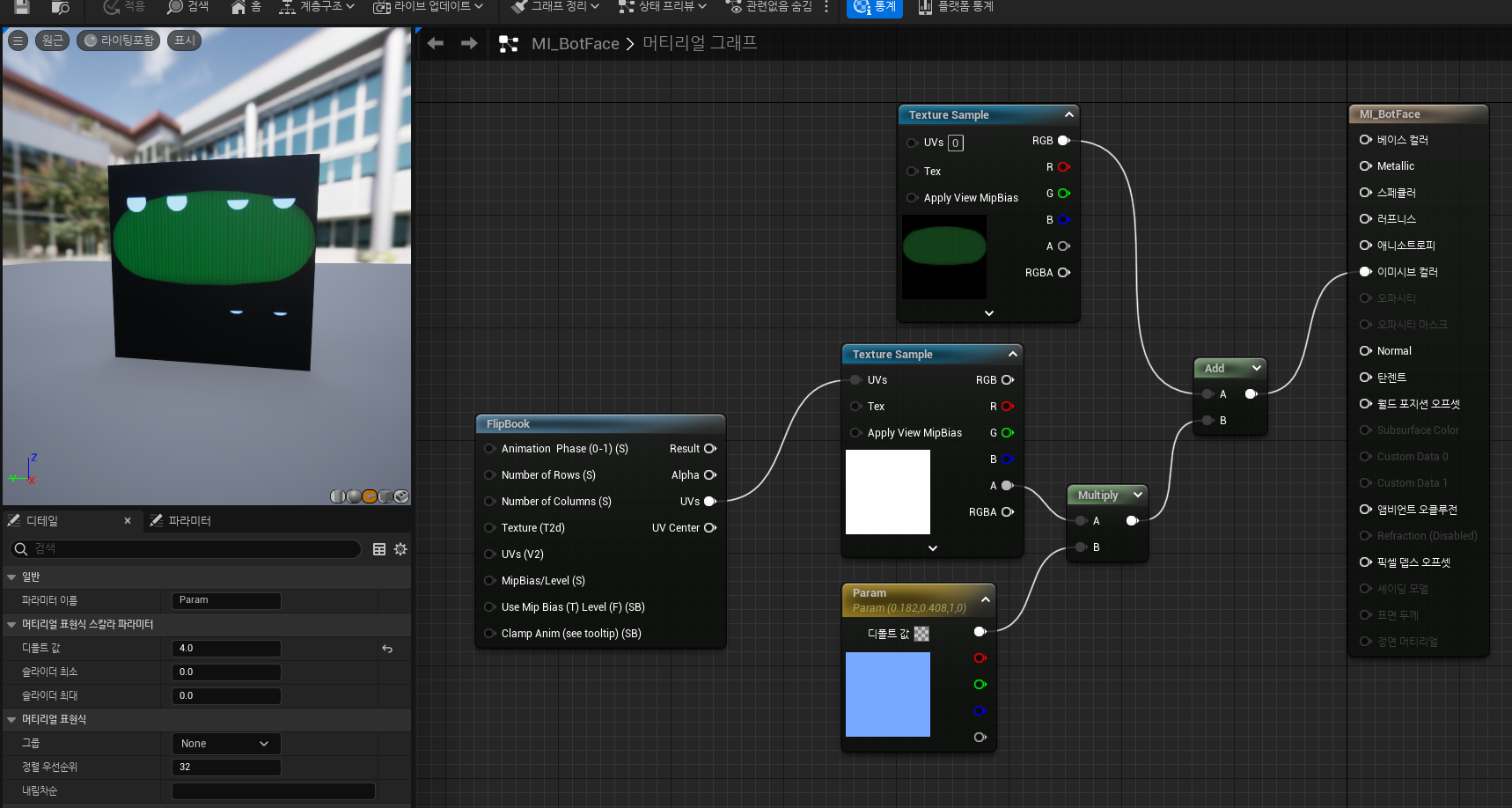 눈 표정 텍스쳐에 색상을 Multiply 하고 베이스 디스플레이 텍스쳐와 Add 처리해서 Emmisive 핀으로 연결. 눈 표정 UV 좌표를 처리하기 위해 FlipBook 노드를 사용하는데, 구체적으로 어떻게 동작하는지는 파악할 필요 있음.