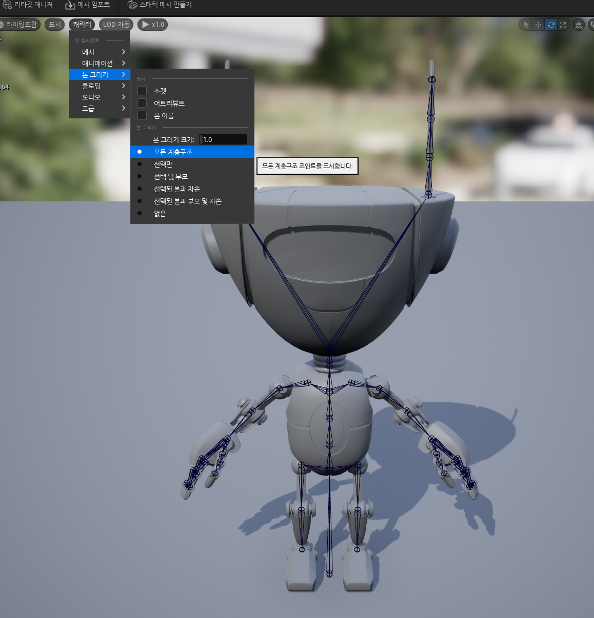 스켈레탈 메시와 스켈레톤 에셋을 열어서 본을 확인해볼 수 있고, 본을 보려면 스켈레톤 에디터에서 캐릭터 / 본 그리기 하위 옵션을 선택하면 됨