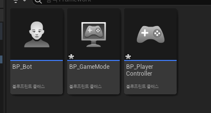 GameMode 와 Pawn, PlayerController 를 변경해본다. 각각의 블루프린트를 생성한다. 이 3개의 블루프린트를 레벨에 맞게 편집해야 함.