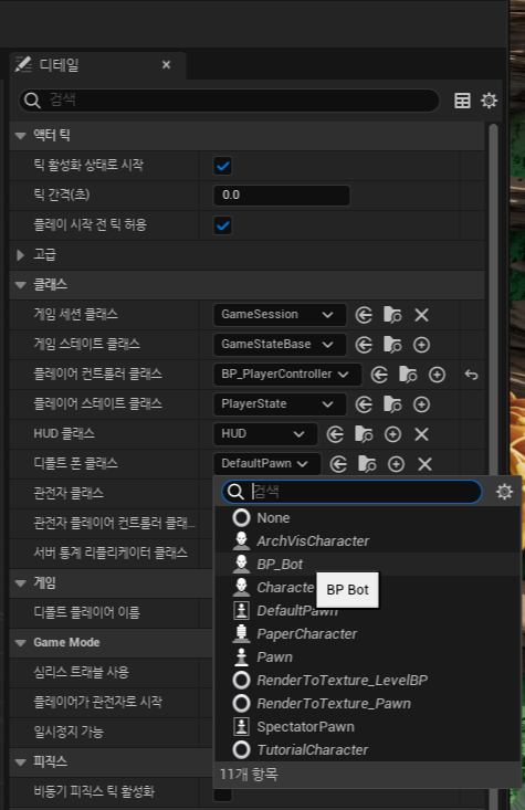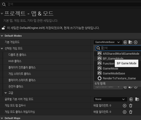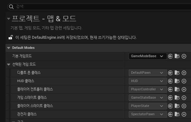 <프로젝트 셋팅 / 맵&모드> 페이지로 이동하면 기본으로 스폰되는 클래스들을 결정하는 옵션들을 볼 수 있음.