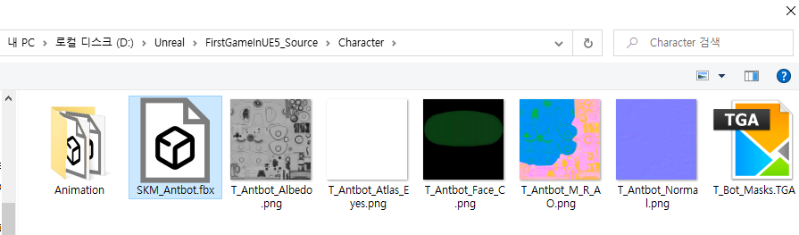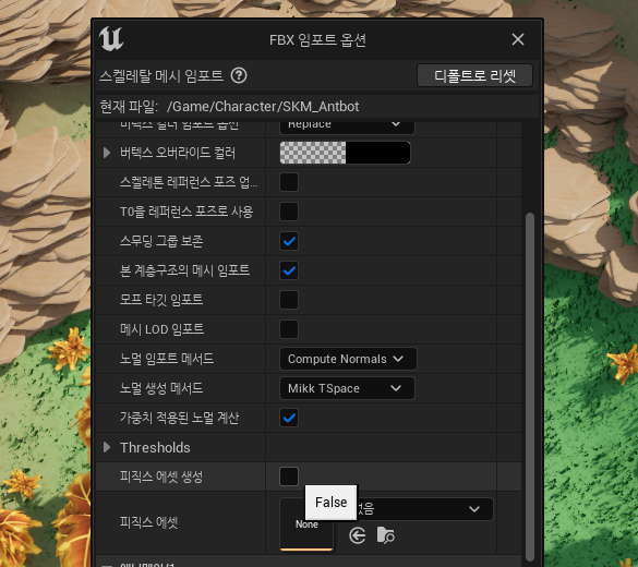 먼저 리소스를 임포트 해야함. 언리얼 엔진에서 스켈레톤 설정된 FBX 를 임포트 할 때 인식해서 옵션창을 띄워줌. 메시를 처음 임포트 할 때에는 Import Mesh 체크, 물리 에셋 생성(Create Physics Asset) 은 체크 해제.