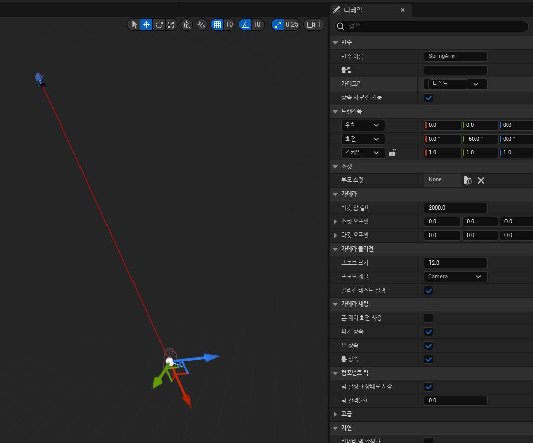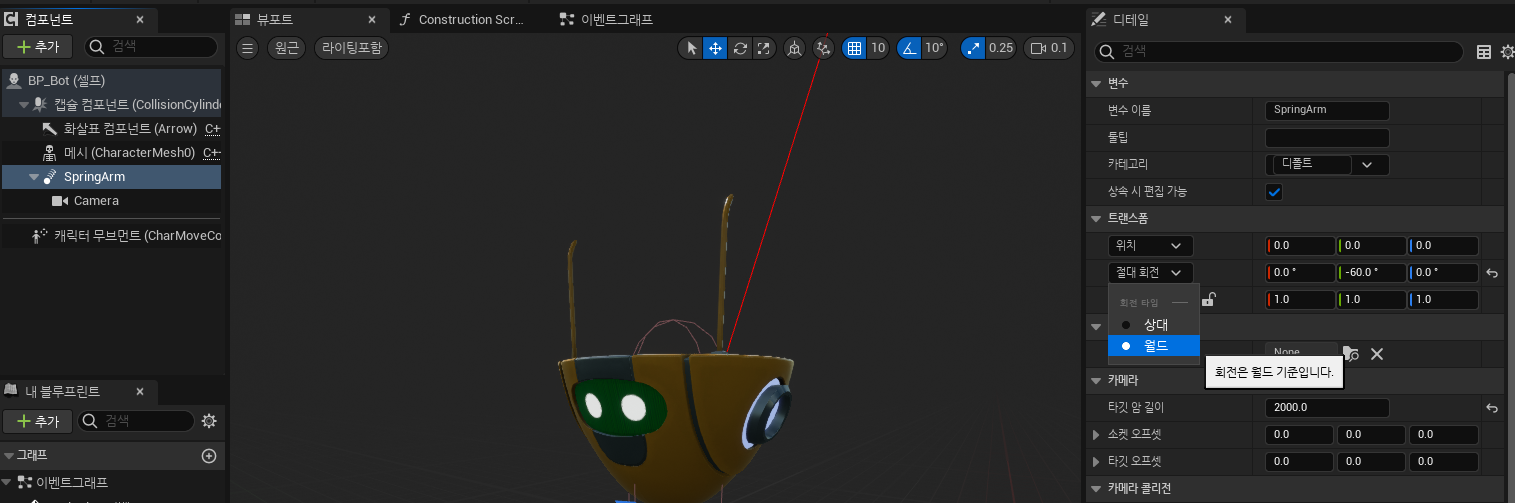 SpringArm 컴포넌트를 선택하고 트랜스폼/회전 타입을 "상대(Related)"에서 월드(Absolute Rotation)로 설정.