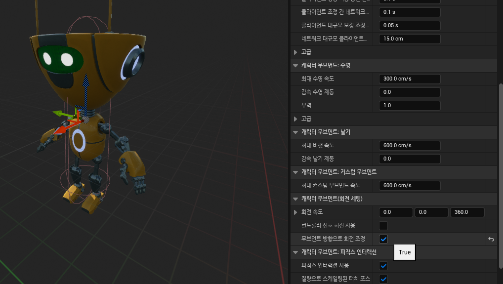 캐릭터가 이동하는 방향으로 메시를 회전시키기 위해 "무브먼트 방향으로 회전 조정(Orient Rotation to Movement)" 을 체크. 여기까지 설정하면, 카메라까지 같이 돌아버려서 어지러운 상황이 발생.