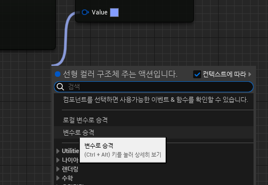이렇게 만든 함수 노드는 "퓨어" 설정으로 실행 핀 없이 언제든 호출하는 형태로 설정할 수 있음.
