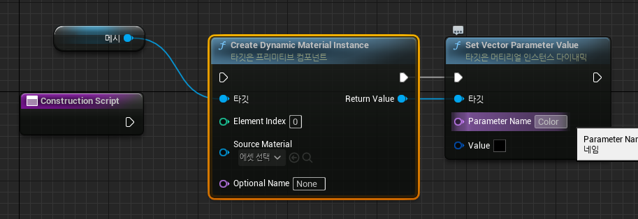 Create Dynamic Material Instance 노드의 Element Index 는 0으로 설정해서, 해당 매시의 0번인덱스 머티리얼의 인스턴스를 생성하도록 함. return Value 로 Material Instance 가 생성되면 Set Vector Parameter Value 를 이용해서 컬러를 파란색 계열로 바꿔준다.