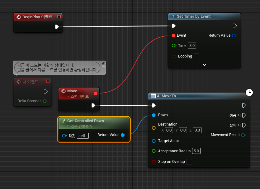이 AI Controller 가 동작하게 하기 위해 블루프린트를 간단하게 편집. Custom Event 를 만들어서 Timer 에 연결하고, 3초 뒤 Custom Event 가 불리면 AI Move To 노드를 이용해서 캐릭터를 이동. 여기서 포지션은 0,0,0 이기 때문에 원점을 향해 달려감.