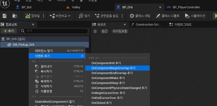 이렇게 하면 AI가 스폰된 Orb 쪽으로 뛰어가는데, 겹친 Orb 는 제거하도록 해본다. Orb 의 블루프린트에서 이벤트를 추가하고, OnComponentBeginOverlap 이벤트를 구현해보는 것으로.