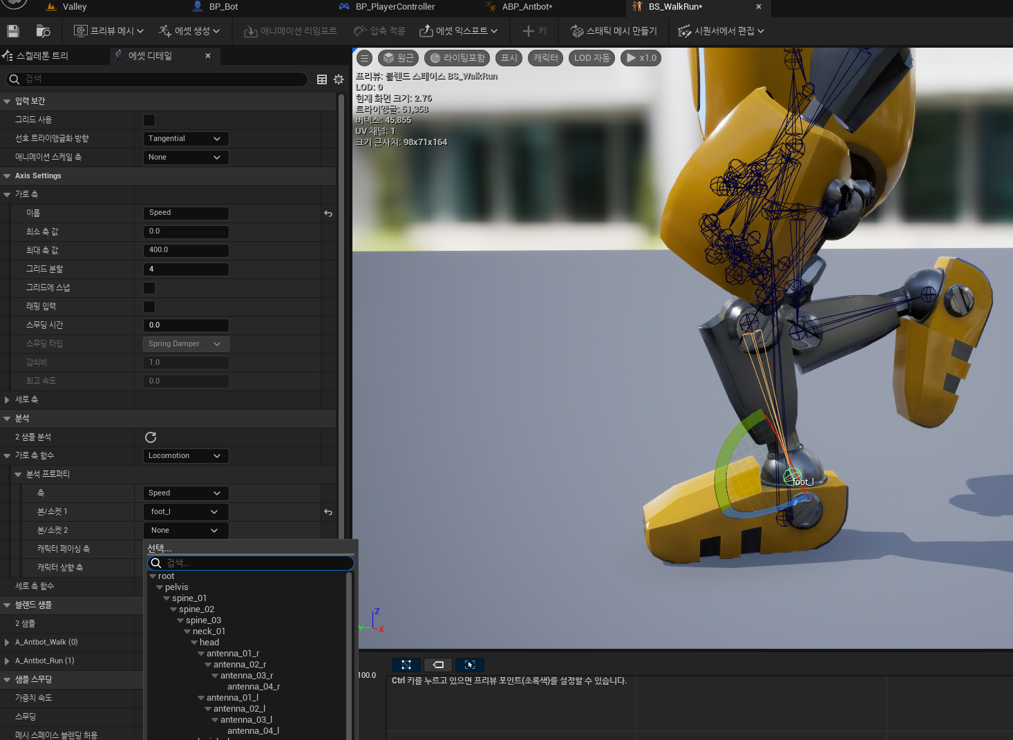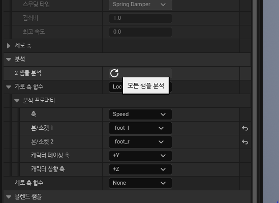 다음은 발이 미끄러지는 것처럼 보이지 않게 분석할 수 있도록 설정할 수 있는데, 좌측 에셋 디테일에서 [분석/가로 축 함수] 타입을 Locomotion 으로 설정. 발의 본을 설정해준다. foot_l, foot_r 이면 됨.