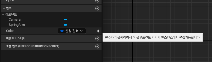 Set Vector Parameter Value 의 Value 값은 변수화 해서 컬러를 셋팅. 변수명은 Color 로 하고, 블루프린트 뷰에서 눈모양 아이콘을 클릭해서 public 변수로 노출시킨다.