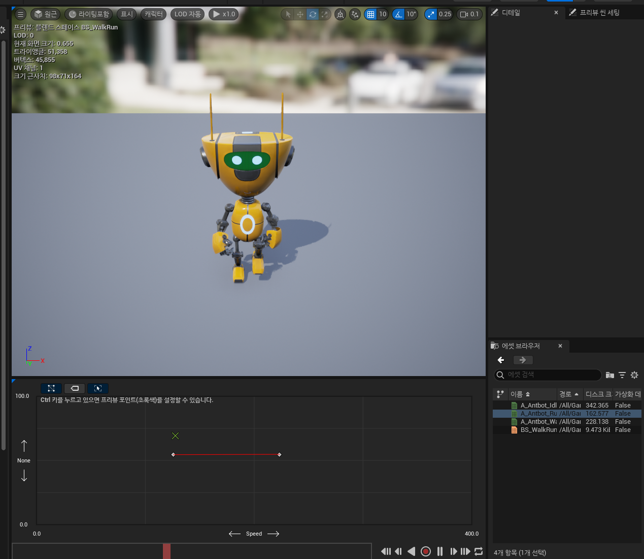 레거시 에셋으로 블랜드 스페이스 D1 도 있는데, D1 은 축이 하나(가로축)만 있는 버전이고, 여기서는 그냥 기본 블랜드 스페이스를 활용한다. 에셋 디테일 뷰에 가로축과 세로축을 볼 수 있음.