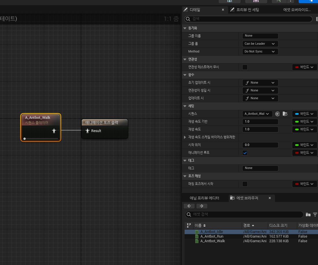 시작하기 전에, 애니메이션 디테일에서 "애니메이션 루프"를 켜줘야 애니메이션이 반복재생 됨.
