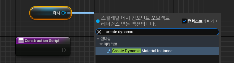 봇과 플레이어의 색상이 동일하기 때문에 머티리얼 인스턴스(Material Instance) 를 생성해서 컬러를 변경해본다. 이 작업은 BP_Bot 의 Contruction Script(생성자 스크립트)에서 처리. 메시 컴포넌트를 드래그해서 블루프린트 노드를 만들고, 핀을 뽑아 Create Dynamic Material Instance 노드를 생성.