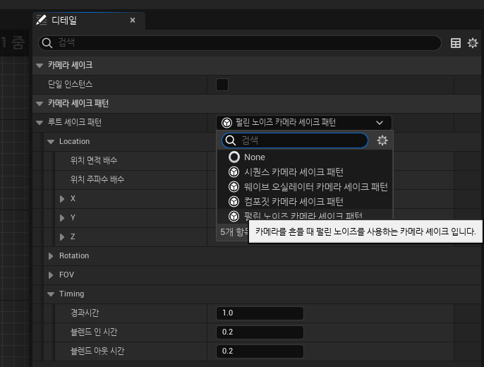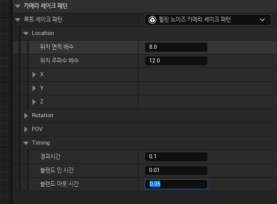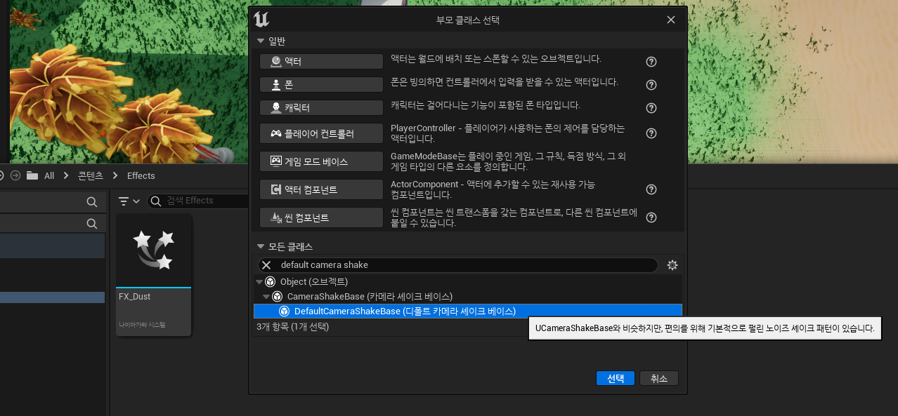 Effects 폴더에 블루프린트를 생성. 디폴트 클래스는 DefaultCameraShakeBase.