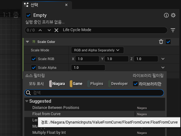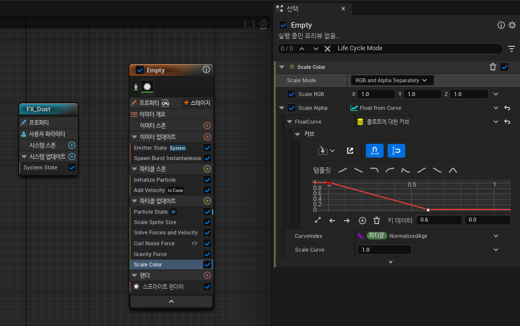 파티클 제작에 필요한 모듈들을 하나씩 추가해줍니다. 마지막으로 Scale Color 를 추가하고, 고정값이 아닌 Curve 로 변경시켜주기 위해 Float from Curve 로 수정해줍니다.