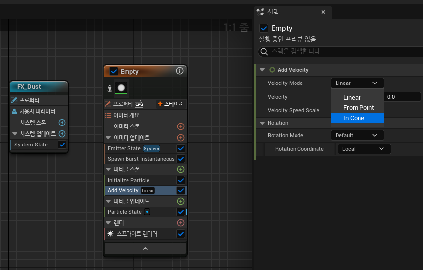 이미터 업데이트 아래에 Spawn Burst Instantaneous 를 추가. Spawn Count 는 10으로. 또, 파티클이 스폰될 때의 속도를 지정하기 위해 Add Velocity 추가. Mode 를 Linear 에서 In Cone 으로. Cone Axis 의 x 값을 -1 로. 등등...