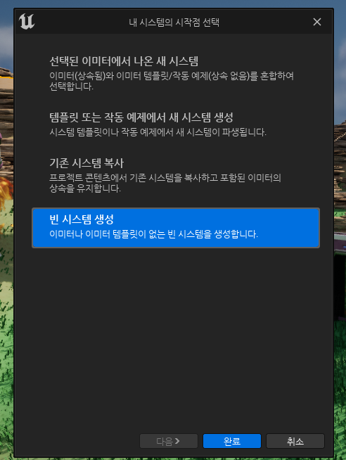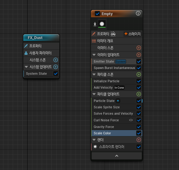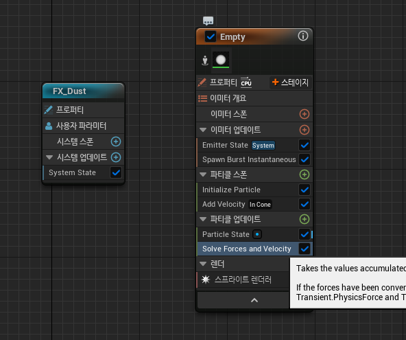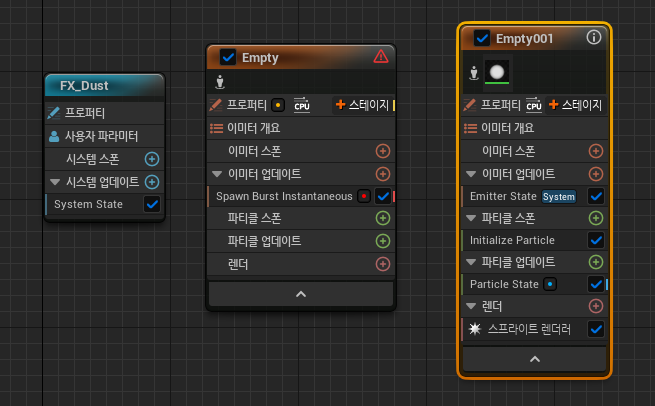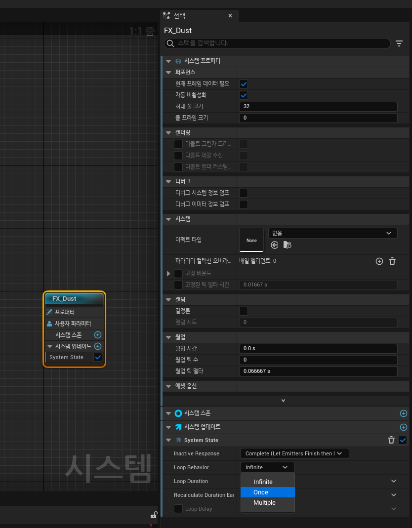 나이아가라 에디터를 열고, FX_Dust 메인 노드 속성 중 System State 아래에 Loop Behavior 를 Once 로 설정해서 한 번만 재생되도록 함. 그리고 빈 이미터를 생성.