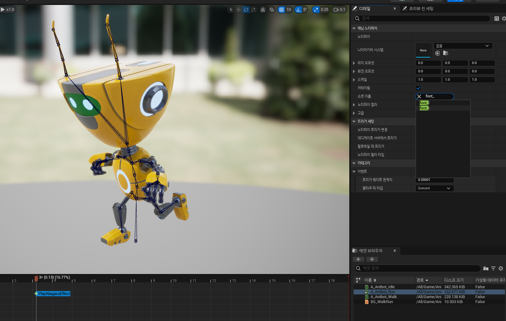 달리기 애니메이션을 열고 발이 닿는 프레임에서 정지. 하단 애니메이션 트랙에서 노티파이 아래에 1 번 트랙에서 적절한 타이밍 위에 우클릭, "노티파이 추가" 로 "나이아가라 파티클 이펙트 재생" 노티파이를 추가. 해당 노티파이의 디테일 뷰에서 앞에서 제작한 나이아가라 파티클을 선택해서 적용.