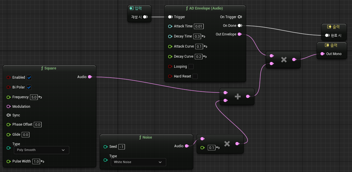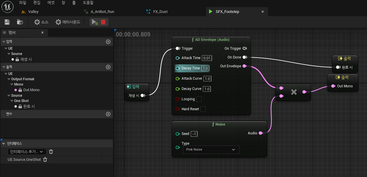 새 메타사운드 에셋을 생성. SFX_Footstep. 에디터를 열고 Noise 노드와 AD Envelope 노드를 활용해서 Multiply 해서 출력 노드로 연결해줌. 오디오 에디터는 중간 수정 과정을 테스트 해볼 수 있는 구조.