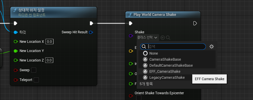 문이 열리고 닫힐 때 카메라를 흔들어주려면 Door 블루프린트에서 Play World Camera Shake 노드를 사용.