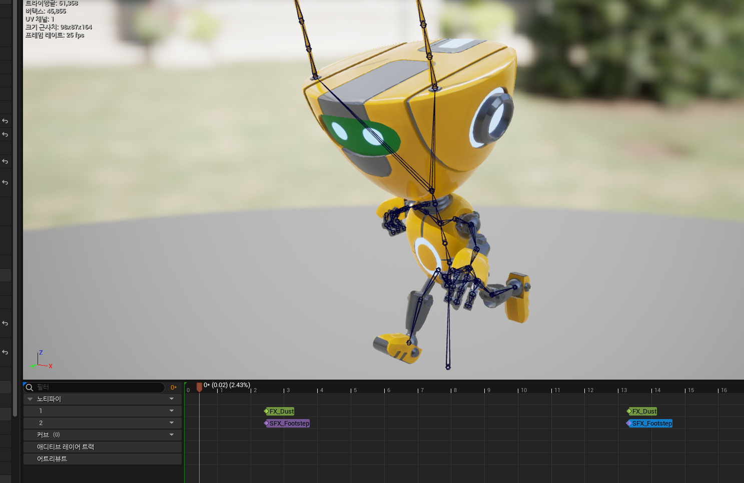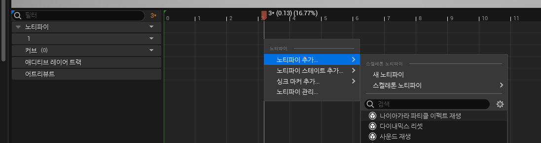 애니메이션에 사운드를 연결할 때는 나이아가라 이펙트를 연결한 것과 동일하게, 노티파이 트랙을 추가하고 사운드를 추가하면 됨.
