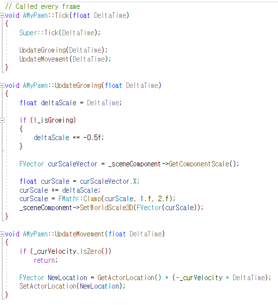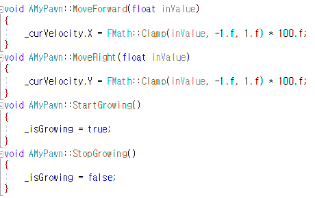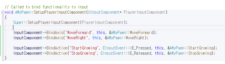 cpp 코드의 SetupPlayerInputComponent 함수에서 축 입력과 액션을 바인딩 해주고 내용을 작성.