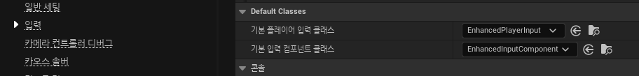 프로젝트 셋팅에서 입력/Defaul Classes 아래 기본 플레이어 입력 클래스/기본 입력 컴포넌트 클래스를 각각 EnhancedPlayerInput/EnhancedInputComponent 로 셋팅.