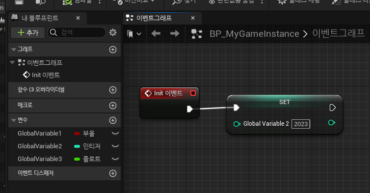 GameInstance 를 상속받는 블루프린트 클래스를 생성하고, 변수를 몇 개 추가. 임의의 값을(2023) 셋팅해주고, 플레이가 시작되면 다른 블루프린트 클래스에서 접근해서 출력하도록 설정.