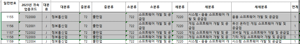 모바일게임, 온라인게임, 패키지게임 마다 업종 코드가 달라짐.