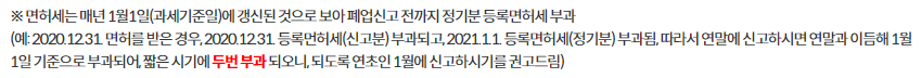 마찬가지로 1월1일 기준으로 등록면허세가 부과되기 때문에 연초에 등록되는 것이 유리. 연말에 등록하면 짧은 시기에 두번 부과.