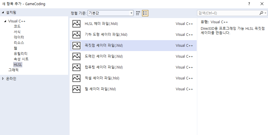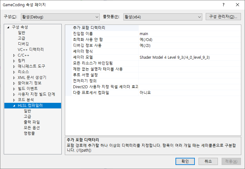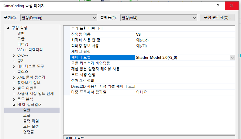 Default.hlsl 파일을 추가하면 프로젝트 속성 페이지 하단에 HLSL 컴파일러 속성 그룹이 추가됨. 중요한 부분은, 진입점 이름. main 함수로 돼있는 것을 적절하게 코딩할 함수 이름으로 수정해주고. 셰이더 모델도 적절한 버전으로 올려준다.