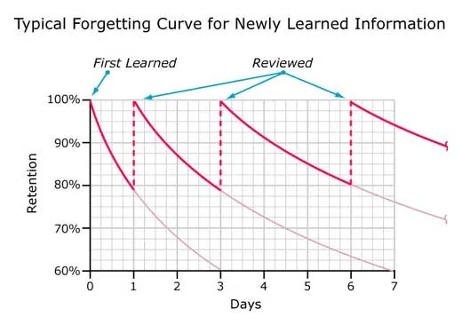 한 번 학습한 것을 다시 학습한다면 망각 속도가 느려지고 효과가 중복 적용되어 복습이 중첩될수록 망각 속도는 점점 느려지면서 장기 기억으로 남는 양도 많아진다.