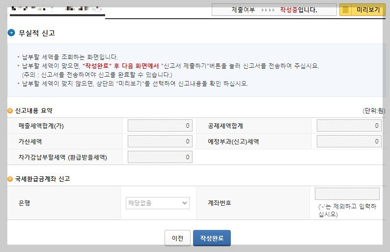 홈택스 부가세 무실적 신고
