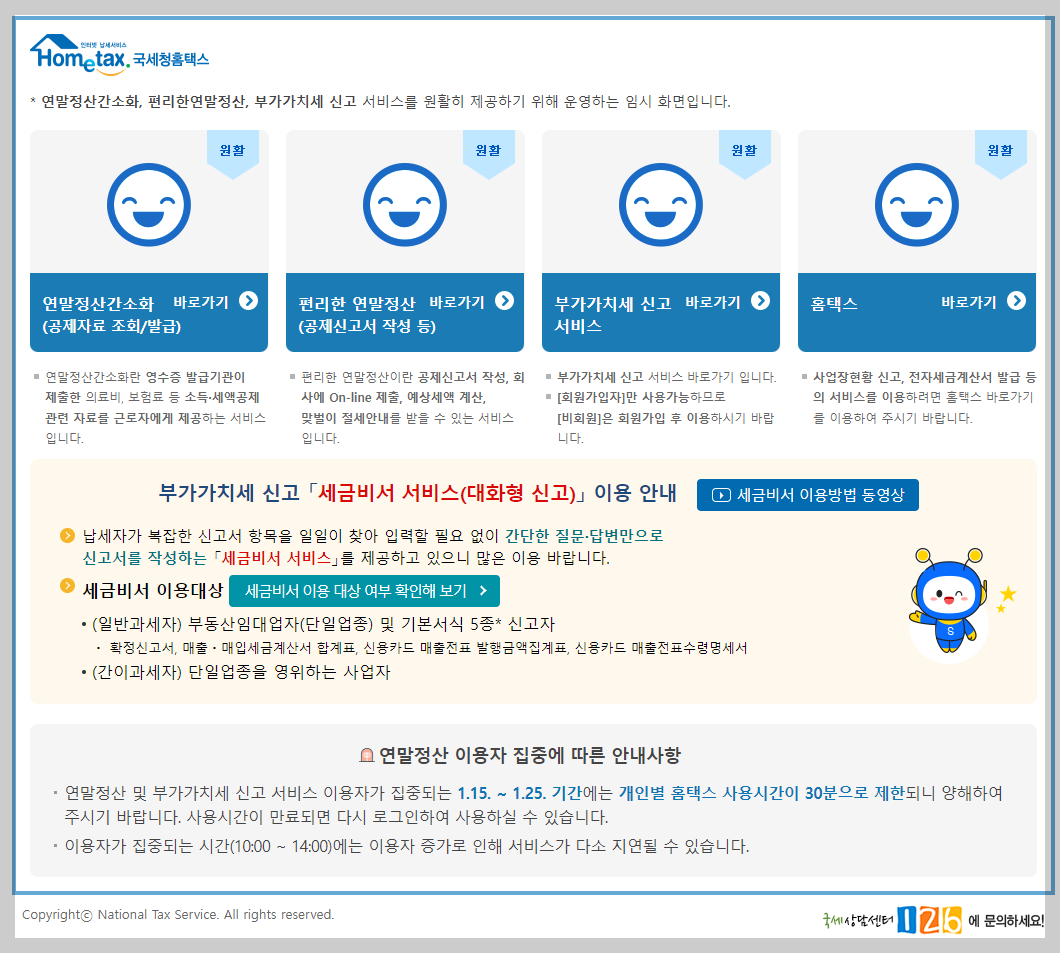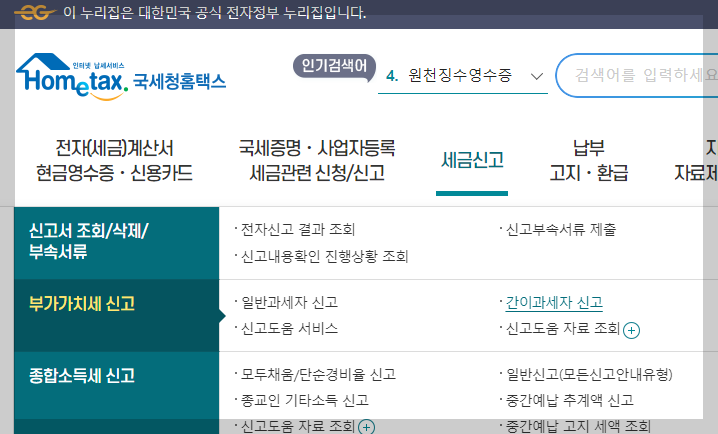 홈택스 접속. "부가가치세 신고 서비스 바로가기"선택하거나, 홈택스 홈 화면에서 부가세 신고 페이지로 이동할 수 있음.