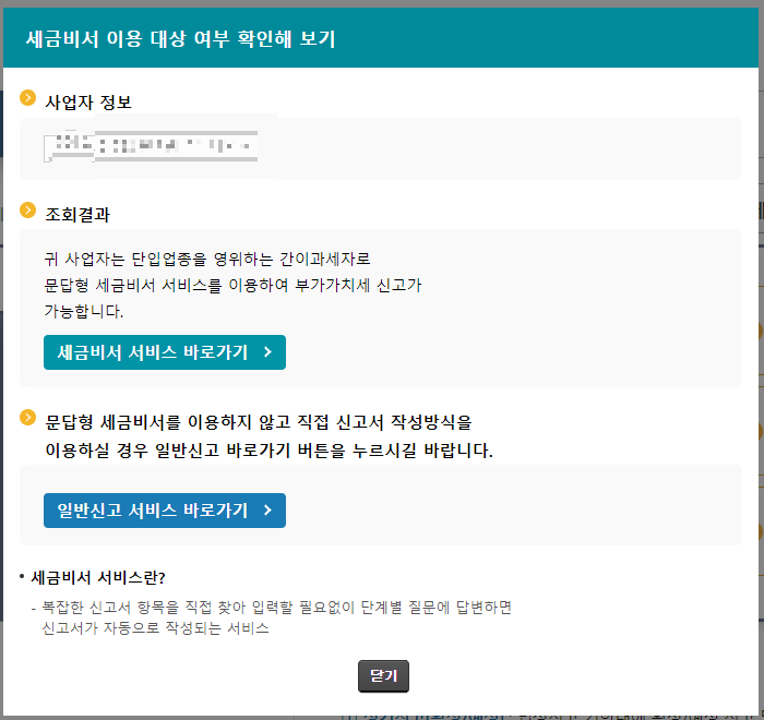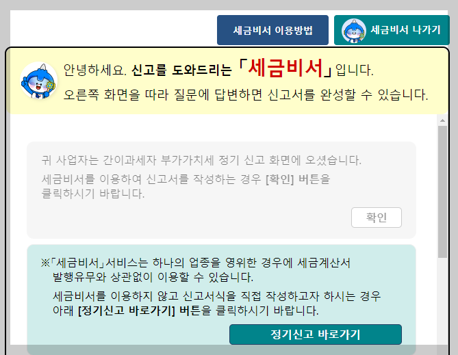 "세금비서 이용 대상 여부 확인해 보기" 팝업창이 뜨는데, 무실적 신고자라면 단입업종/간이과세자 해당할 수 있음. 확인해보고 세금비서 서비스 바로가기 클릭.
