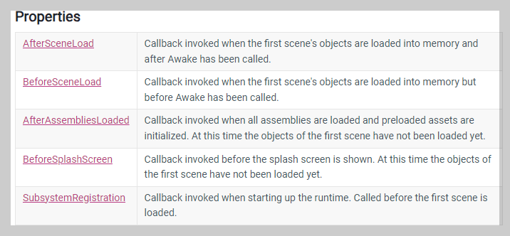 위에 나열한 RuntimeInitializeLoadType의 모든 Properties 의 설명은 아래와 같음.